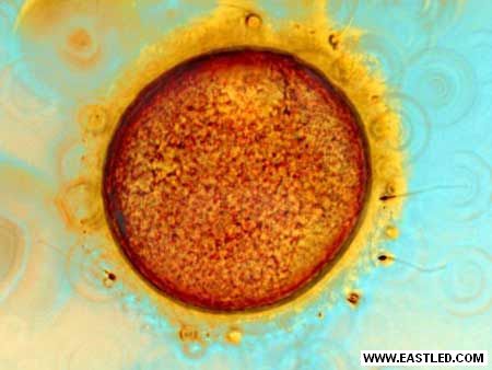 人工試管受精 這張顯微照片明白地捕捉到人工試管受精(IVF)過程。圖中的卵細胞(棕色球體)要比精子細胞大很多,其四周繚繞著保護積云細胞(圖中黃色部分),卵細胞四周的薄膜是卵膜,精子頭部攜帶著酶試圖溶解卵膜,從而與卵細胞聯合。圖片是由斯匹克-沃克爾(SpikeWalker)供給的。