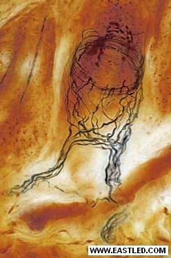 這張顯微圖像顯示的是毛囊的感到神經末梢。感到神經末梢(sensorynerveending)是感到神經元四周突的終末部分,該終末與其他結構共同組成感受器。感受器能接收內、外環境的各種刺激,并將刺激轉化為神經激動,傳向中樞,產生感到。圖中的色彩是將該組織用硝酸銀處理后浮現的,如同處理膠片一般。神經軸突是正在消褪的玄色部分。照片是由斯匹克-沃克爾(SpikeWalker)供給的。