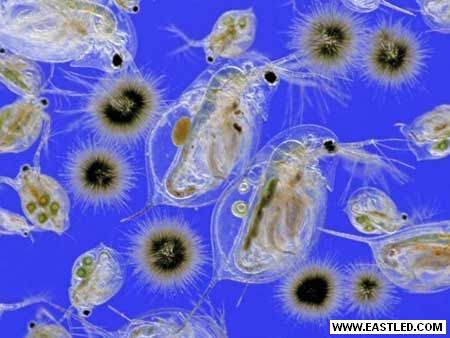 海洋浮游生物 這是斯匹克-沃克爾拍攝的浮游生物顯微照片。拍攝時采用了萊因伯格照明法,憑借有色盤供給的鮮艷色彩,使快速移動的浮游生物在明亮藍色調下明白可見。 海洋浮游生物是非常小的有機生物,漂浮在海面上,很少或不具備移動才能。海洋浮游生物分為兩大類型:浮游植物和浮游動物。浮游植物是植物性浮游生物,在海面以下較淺的水深漂浮,依附光合作用獲得能量;浮游動物是包含小型原活潑物和多細胞動物在內的動物,它們重要以浮游生物為食。