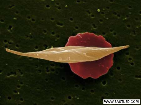鐮狀細胞貧血癥血紅細胞 這張圖片顯示了兩個血紅細胞。背景中顯示的一個正常的紅細胞,而前景顯示的是一個受到鐮狀細胞貧血癥沾染腐化的血紅細胞。鐮狀細胞貧血癥是一種血液疾病,可導致細胞形成特別的外形,從而轉變其攜帶血紅蛋白的才能。 鐮狀細胞貧血是20世紀初才被人們發明的一種遺傳病。1910年,一個黑人青年到醫院看病,他的癥狀是發熱和肌肉疼痛,經過檢查發明,他患的是當時人們尚未熟悉的一種特別的貧血癥,他的紅細胞不是正常的圓餅狀,而是曲折的鐮刀狀。后來,人們就把這種病稱為鐮刀型細胞貧血癥。鐮刀型細胞貧血癥重要產生在玄色人種中,在非洲黑人中的發病率最高,在意大利、希臘等地中海沿岸國家和印度等地,發病人數也不少。