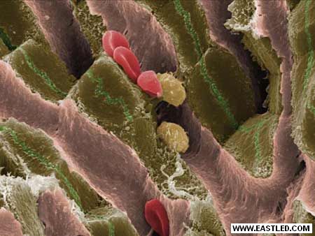 老鼠肝臟細胞 這張顯微圖片顯示的是老鼠肝臟的內部結構,有助于懂得該復雜器官。呈正弦曲線的血管是圖中遍及肝臟內部的粉紅色結構,血管中包含著血紅細胞和庫普弗細胞,它們是肝臟內部的巨噬細胞。肝細胞是圖中褐色部分,繚繞著正弦曲線血管排列著。 膽汁被分泌進小管之中,圖中以綠色管道顯示,它們是肝細胞之間擴大的細胞間隙,膽汁在其中流向小腸。