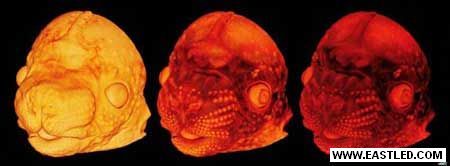 早期胚胎發展階段的老鼠頭部 這張3D圖片顯示的是早期胚胎發展階段的老鼠頭部,是由高明白反相顯微鏡拍攝的。在拍攝過程中,樣本放在塑料片上,然后涂上曙紅熒光色。這種顯微鏡薄片切片機可切割非常薄的樣本,最薄達到2微米。 應用盤算機軟件,老鼠頭部的不同結構得以成像。圖片是由英國醫學研究理事會所供給的。