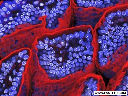 老鼠小腸內壁3D結構 如圖所示,這是應用多光子熒光方法浮現的老鼠小腸的內壁3D結構,在小腸內壁的指狀長茸毛可增大小腸內壁表面積,因而有助于消化。通過聯合多張圖片的觀測,保羅-阿普爾頓(Paul Appleton)和他的同事們得以調查結腸癌導致的小腸內病變。照片是由保羅-阿普爾頓(Paul Appleton)供給。
