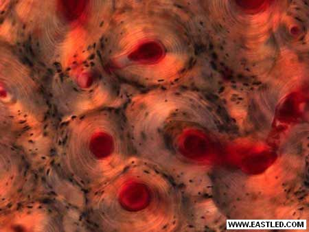 人體股骨的密質骨骼 如圖所示,這是人體股骨的密質骨骼圖像,其中顯示出包含血管和結締體素的微型管道網絡。密質骨使人體骨骼堅硬有力,它是由多層有機物質和無機鹽構成的。 存活的密質骨細胞在樣本制備過程中已被摧毀,留下小孔。空氣充滿在在這些小孔之中,由于視覺折射作用應用這些小孔浮現出玄色。圖片是由艾弗-梅森(IvorMason)拍攝并供給的。