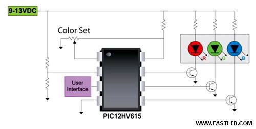 圖中的PIC12HV615閃存微把持器整合了分流穩壓器、供給8MHz時鐘的振蕩器、重設電路和模仿數字轉換器,供給一個完整而機動的單芯片解決計劃。此閃存組件的電路內可程序化功效也答應在生產時履行色彩校準過程,從而為補償各種發光器的性能差別和組件之間的差別供給了一種方法。 @@@@@@@@@@