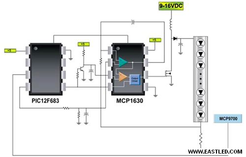 應用多個恒流驅動拓撲來履行所需的功率轉換,隔離、功率因子校訂和/或僅改良現有解決計劃可能都需要應用兩級處理。輸進電壓首先下降到中間電壓,在此級應用傳統技巧滿足功率因素校訂(PFC)和高電壓隔離請求,而第二級負責滿足LED電流和溫度把持請求。圖2顯示一個智能LED解決計劃,它在恒流配置中采用升壓轉換器MCP1630。一個小型的8位微把持器可供給機動的時鐘源、可程序化電流設定點(為了使驅動電路符合不同的LED模塊規范)以便進一步節儉功耗的調光功效,還供給應用遠程溫度傳感器(整合的溫度傳感器如MCP9700或熱敏電阻)進行的逝世循環溫度把持。